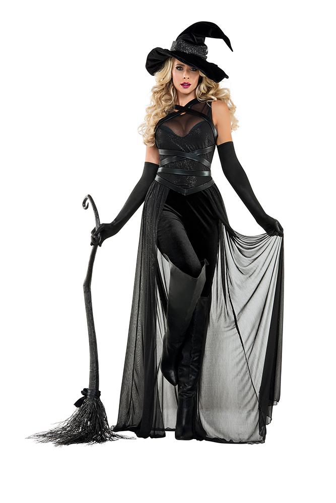 Raven Witch velvet romper with glitter mesh overlay top and skirt, trimmed with wet-look straps and top. Hat and gloves included. Broom not included.